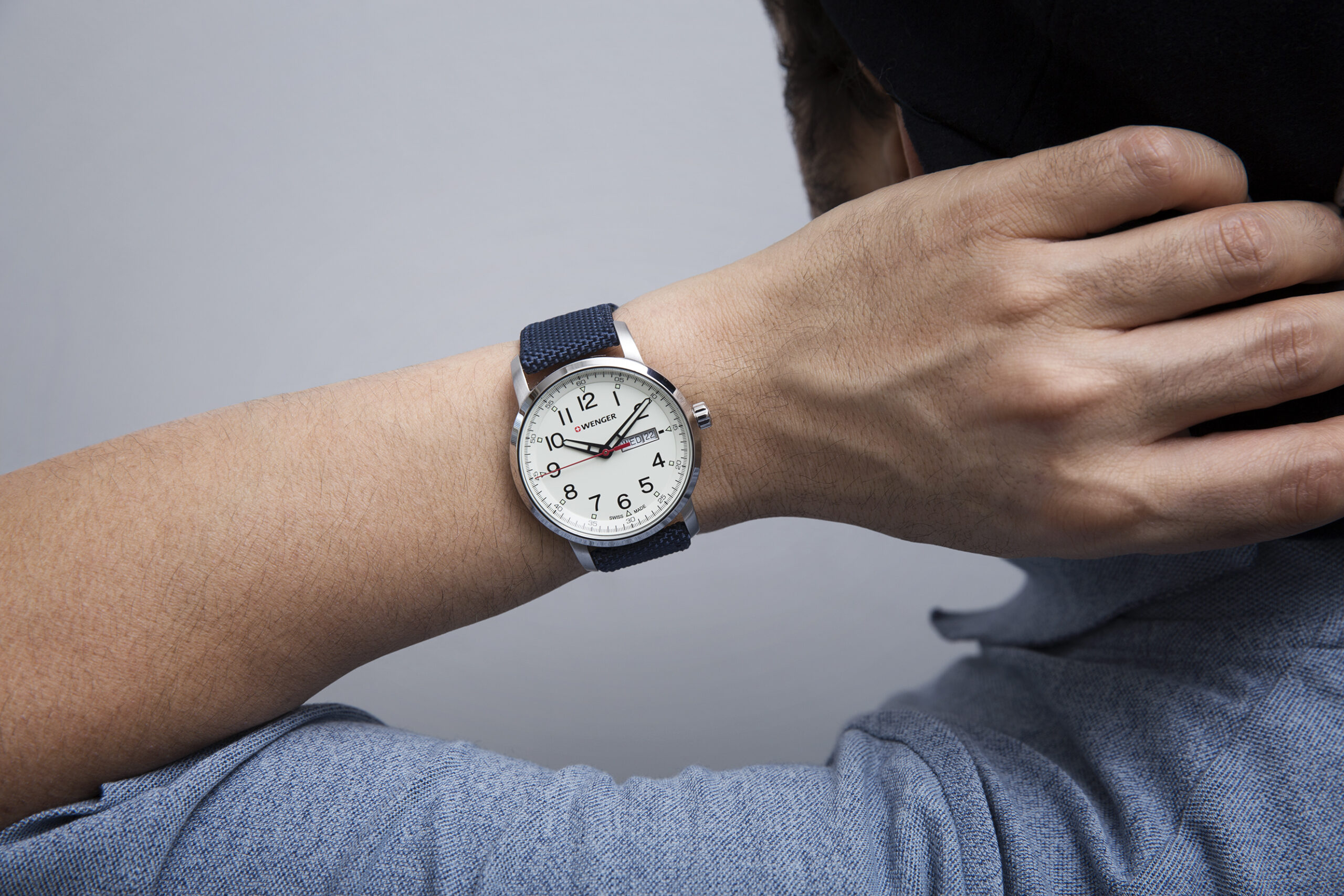 Ur med sorte visere og tidsmarkører, dag og dato display og en cremefarvet skive. Uret er lavet med en kasse af rustfrit stål og en blå rem af nylon og læder.
